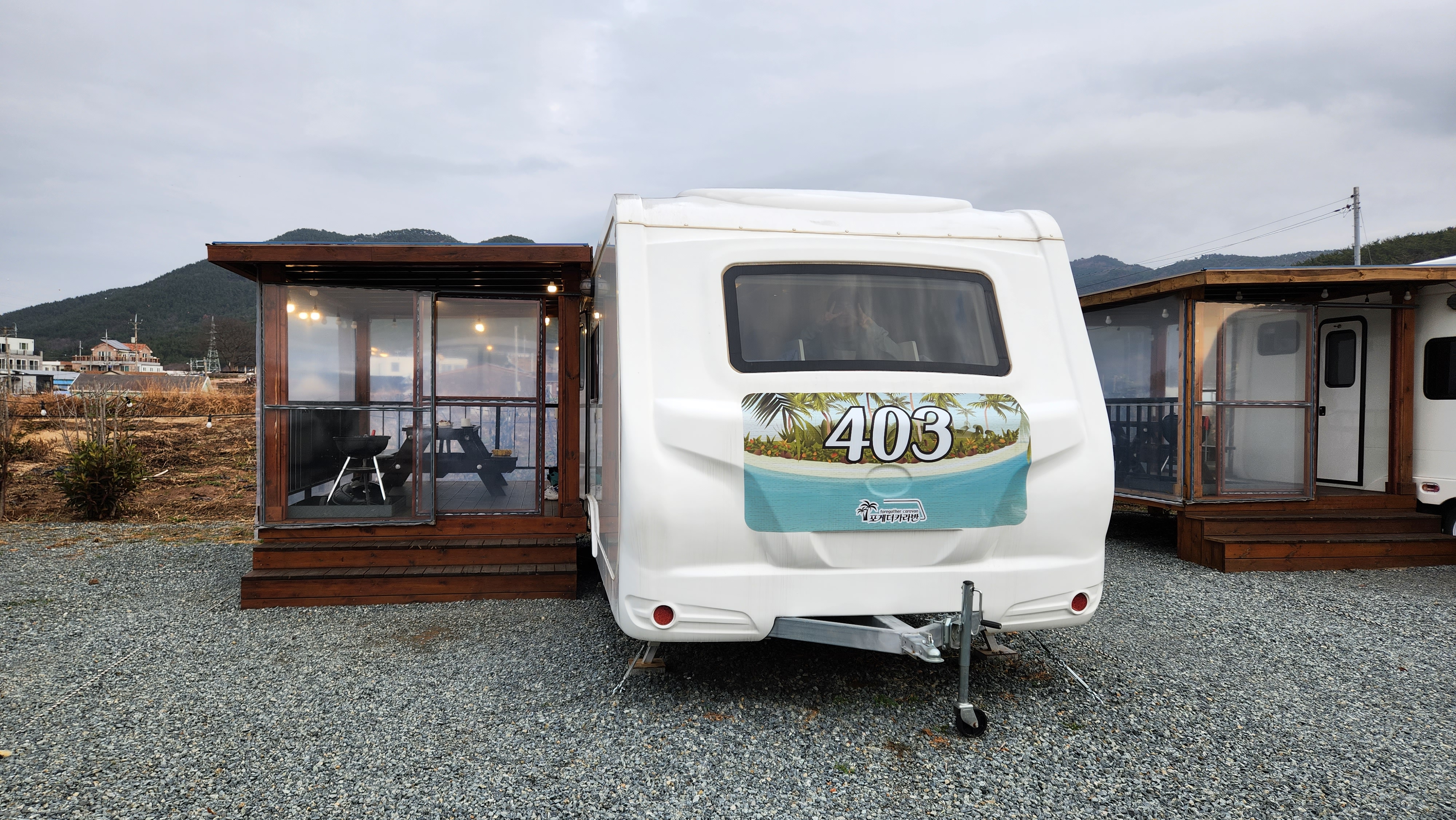 카라반옆에 바베큐를 해서 먹을 수 있는 공간이 붙어 있어서