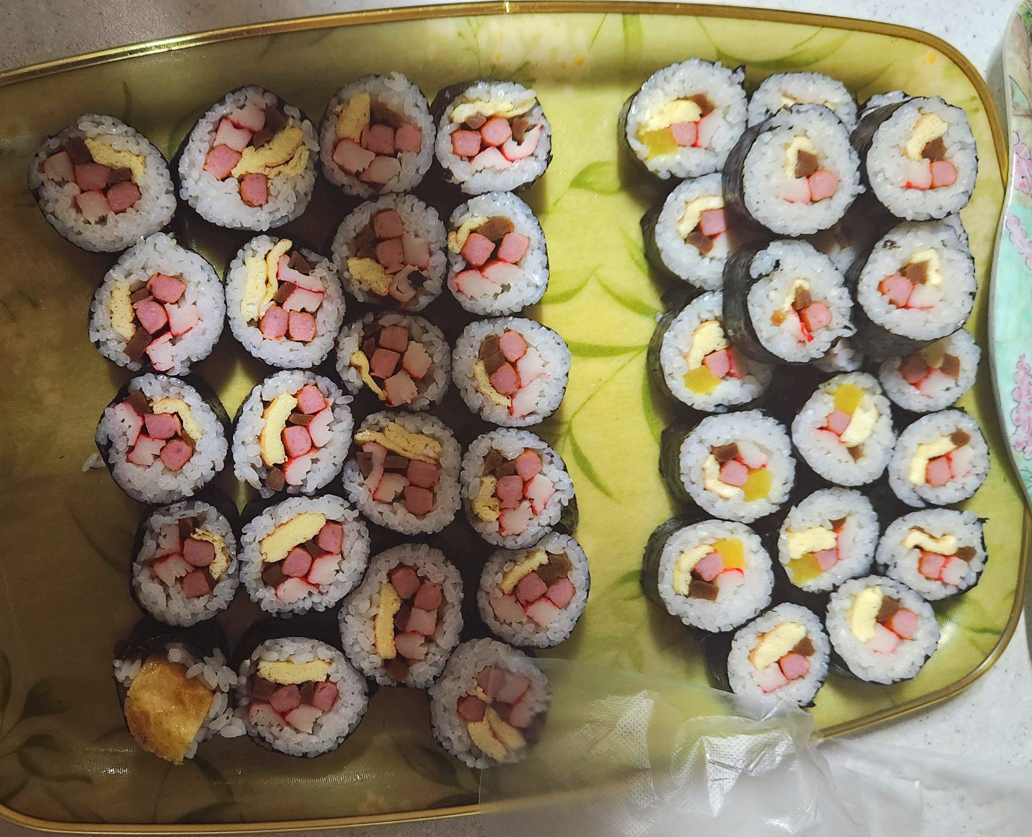 오른쪽은 일반김밥이고요 왼쪽은 재료가 조금 남아서 다 넣고 김밥을 말아서 재료가
