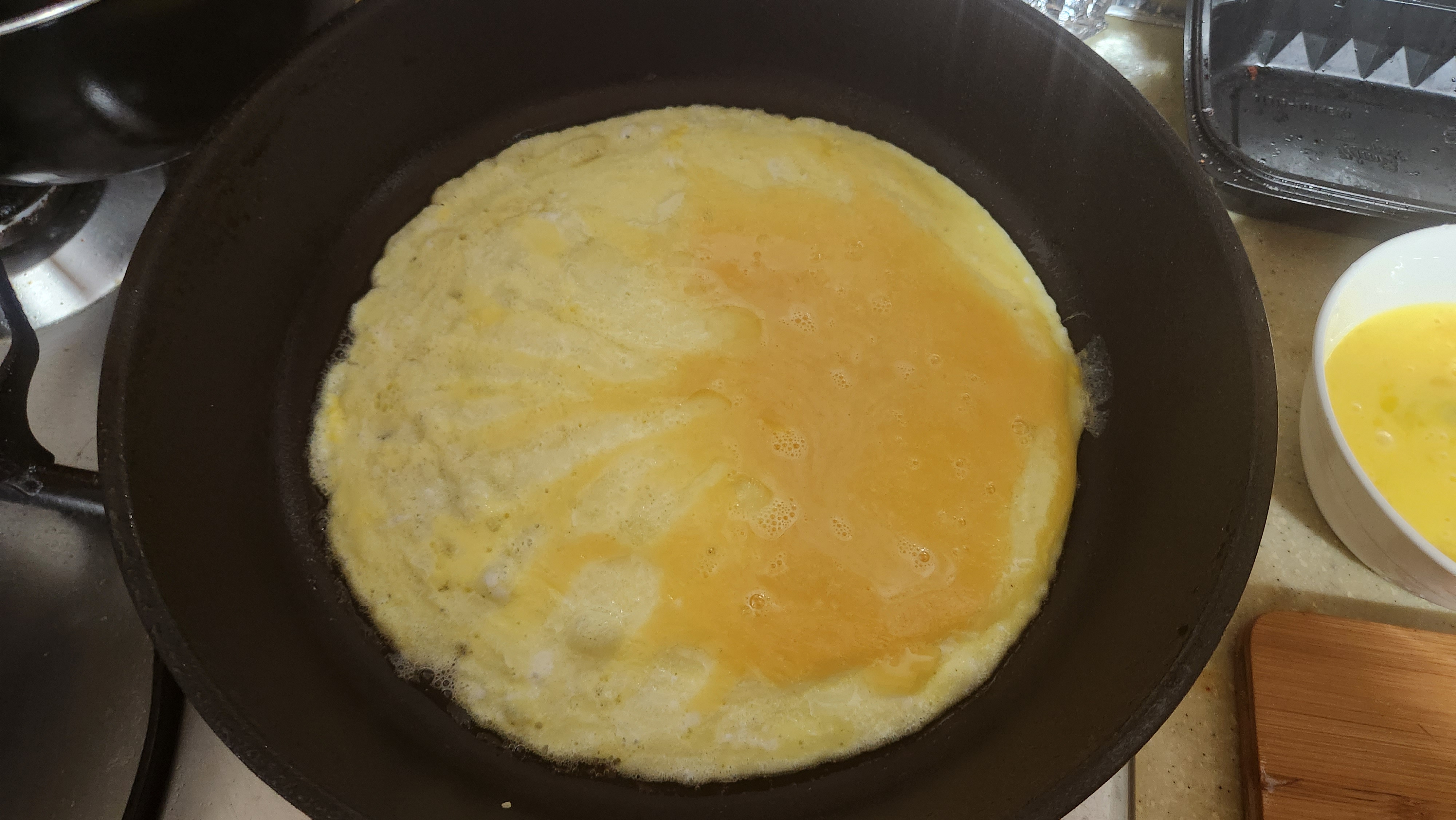 위의 계란물이 거의 없을 때쯤 뒤집어 주세요