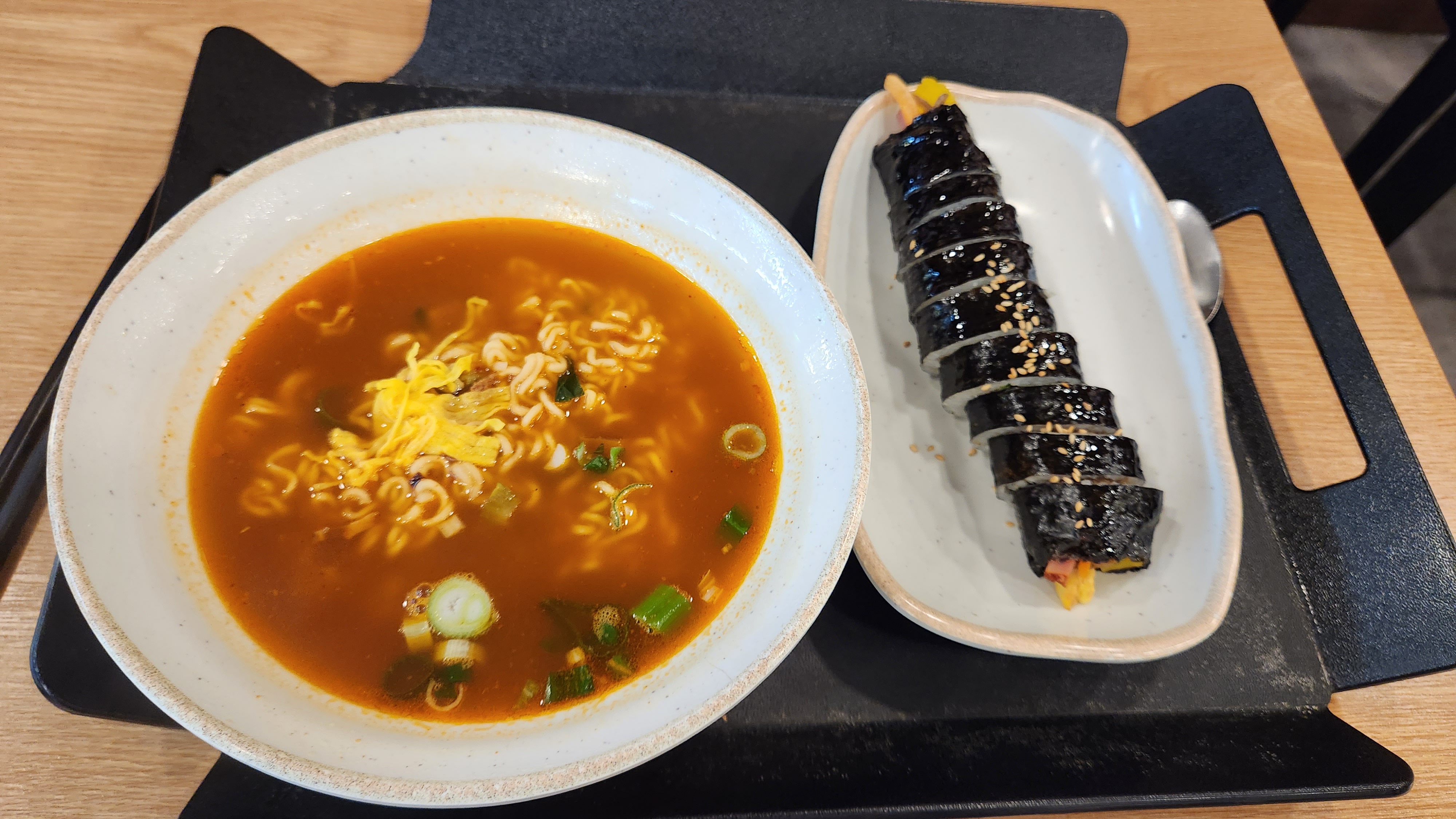 김밥은 야채김밥(기본김밥)에 라면은....안성탕면인가.....신라면이라면 약간 더 매콤할 텐데