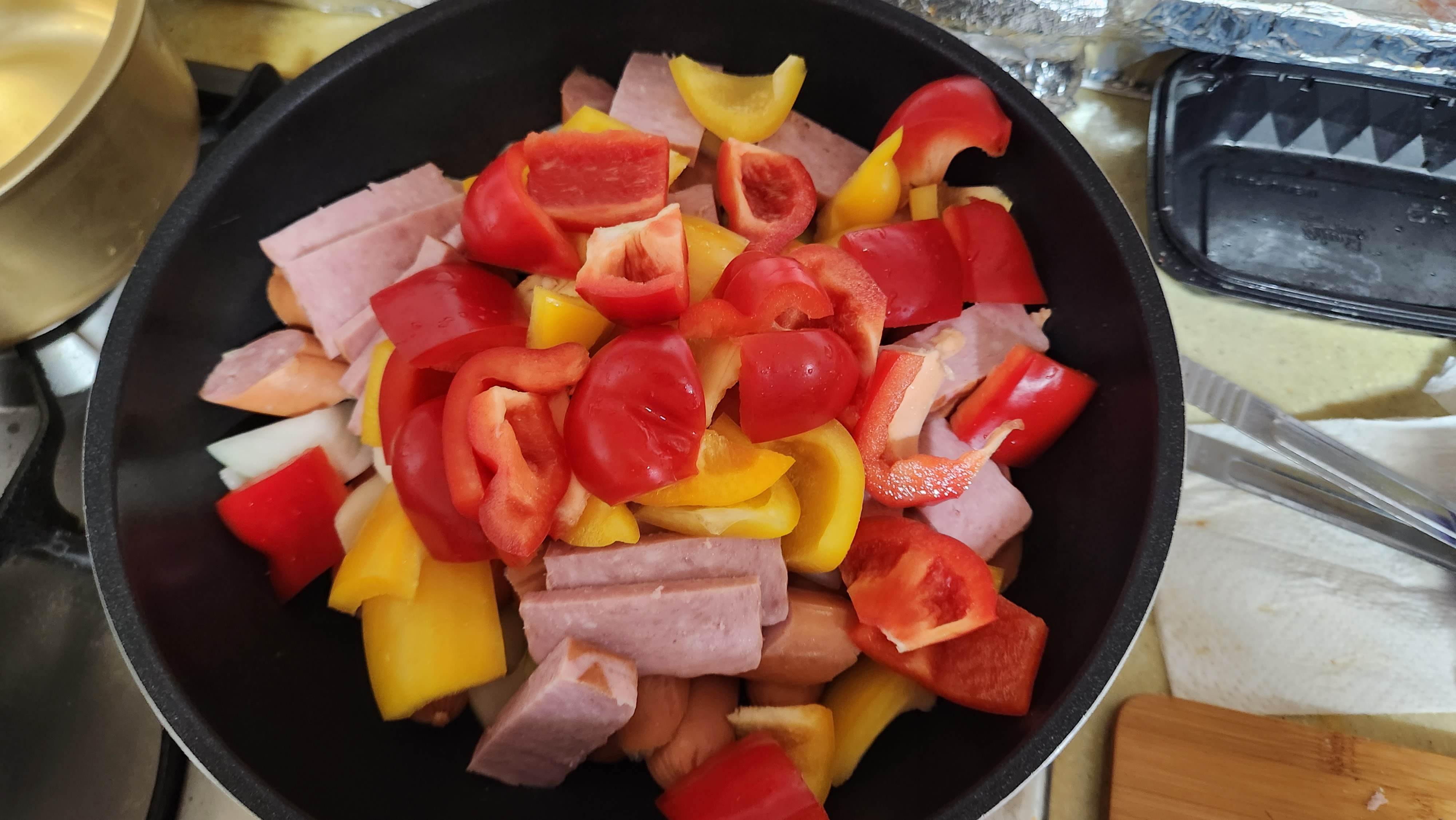 재료는 후랑크소세지, 네모난 햄, 비엔나소시지, 피망, 양파, 청양고추, 케첩등이