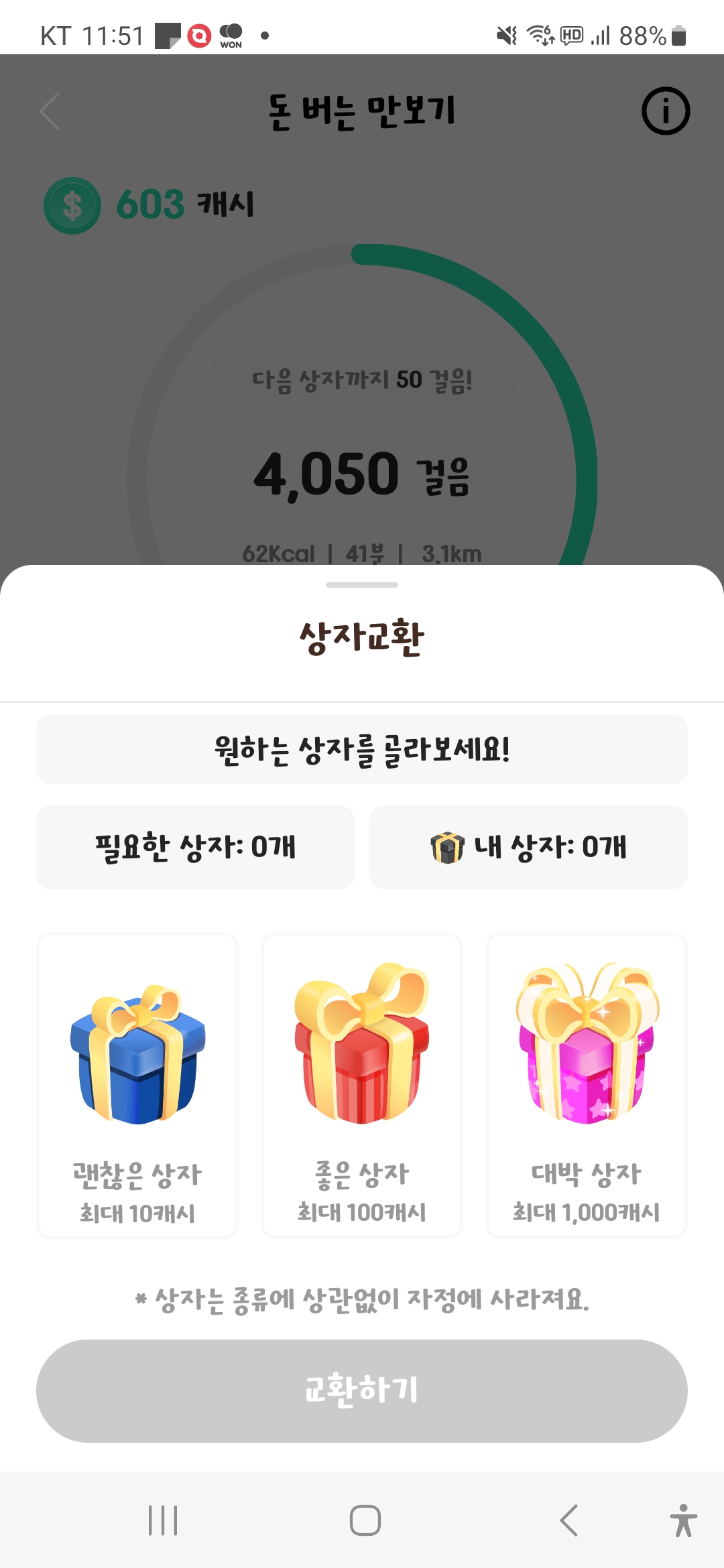 오늘 4000걸음 걸어서 상자교환으로 대박상자 4개 바꿨습니다