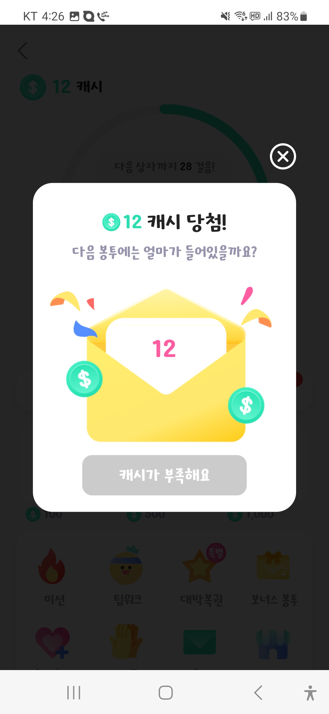 아래를 보시면 공짜가 아닌 봉투를 열 때마다 20 캐시가 차감된다고 나옵니다