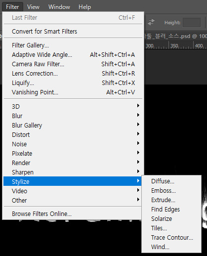 Filter -> Stylize -> Wind(바람효과), Filter -> Distort -> Ripple(잔물결효과) 등