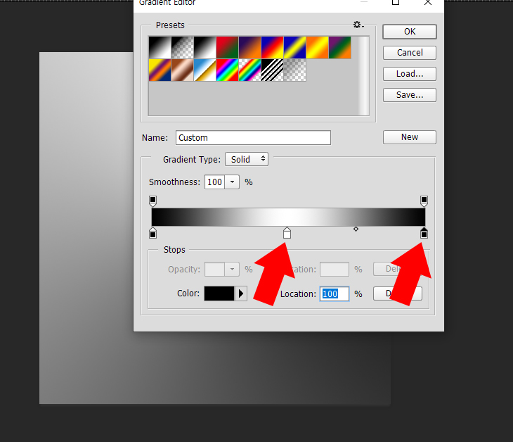 클릭한 후에 화면 왼쪽 상단 그라디언트에디터(색상띠)를 클릭하여