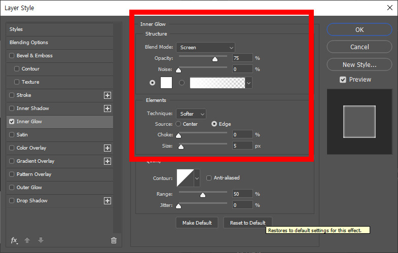 Inner Glow(이너 글로우 : 확산효과) 효과는 기본적으로 안쪽으로 밝게 번지는 형식으로 적용이 됩니다