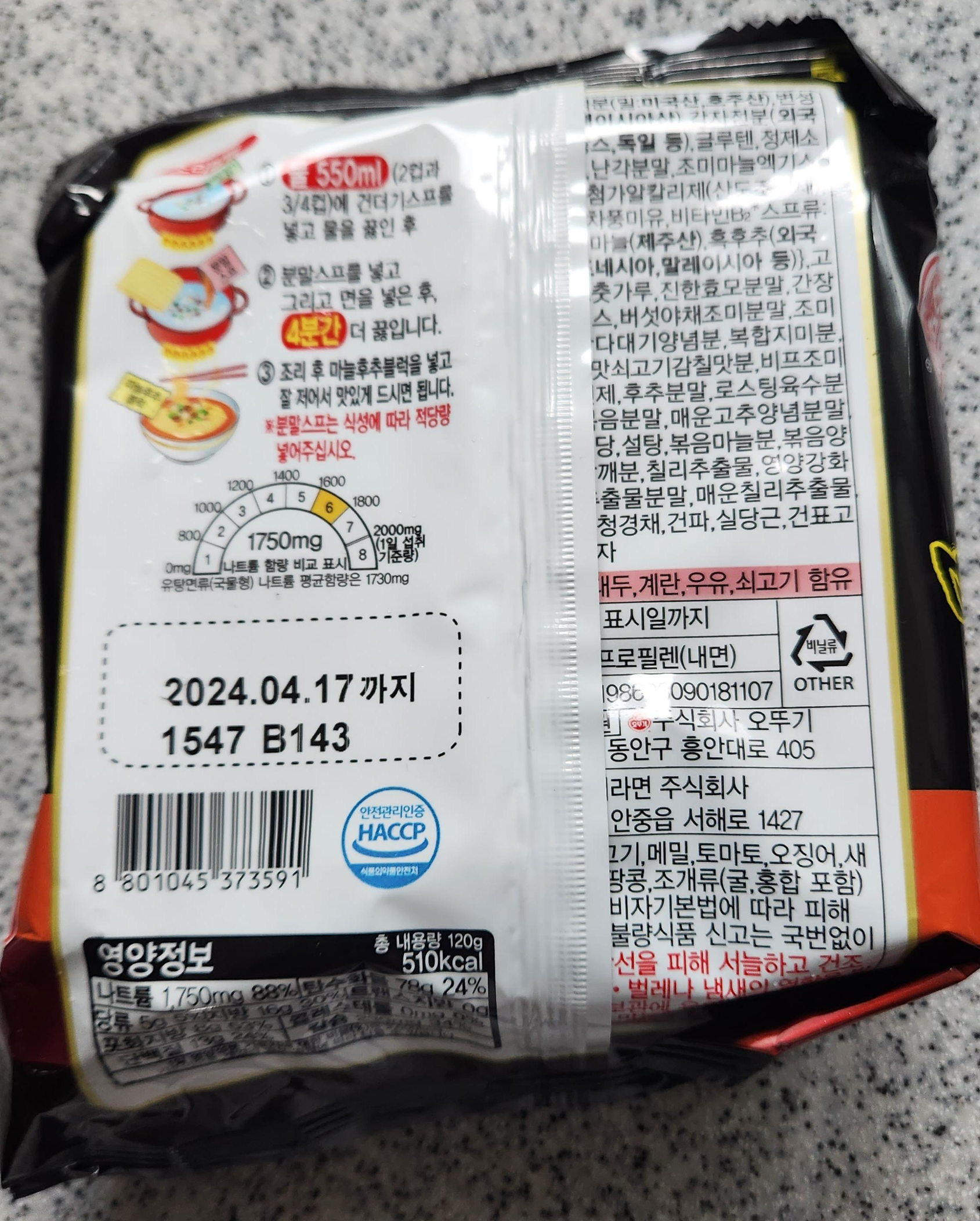 끓인는 방법은 물 550ml에 건더기스프를 넣고 물이 끓으면 분말스프와 면을 넣고 4분간