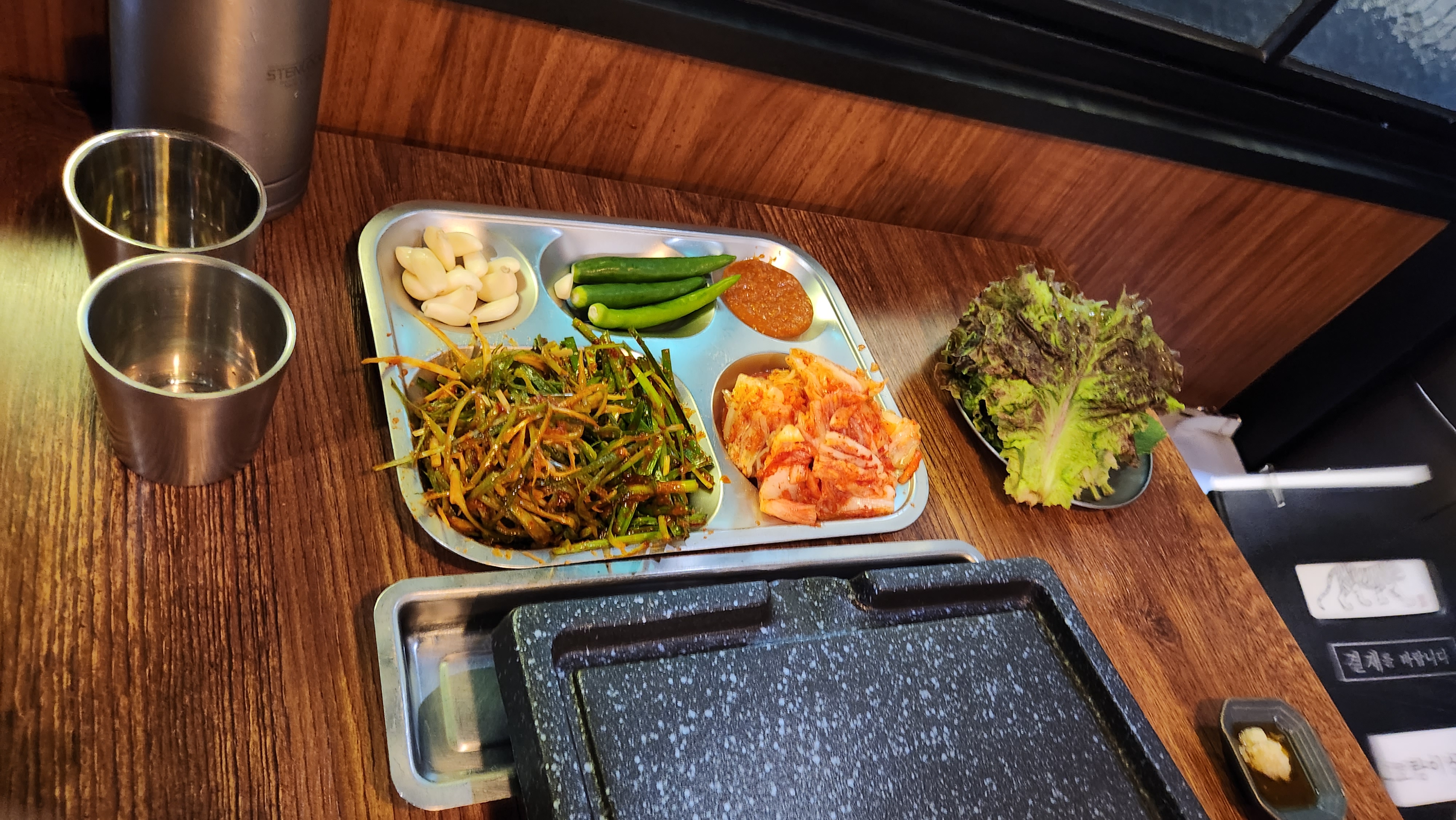파무침, 김치, 마늘, 상추, 청양고추(엄청 매워요)가 나오고 찍어 먹는 마늘기름장이 나옵니다