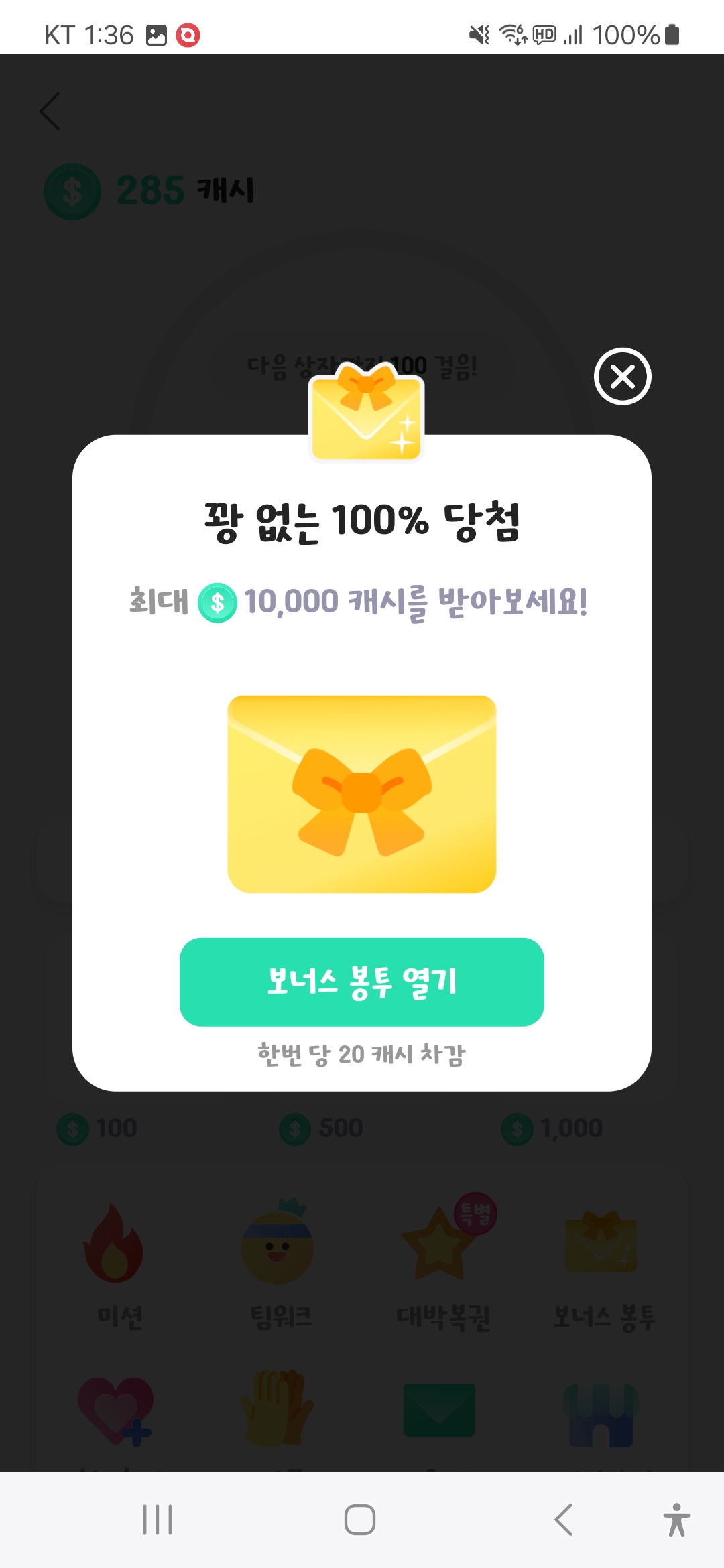 보너스봉투를 한번 열 때마다 20 캐시가 소진이 됩니다