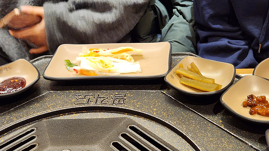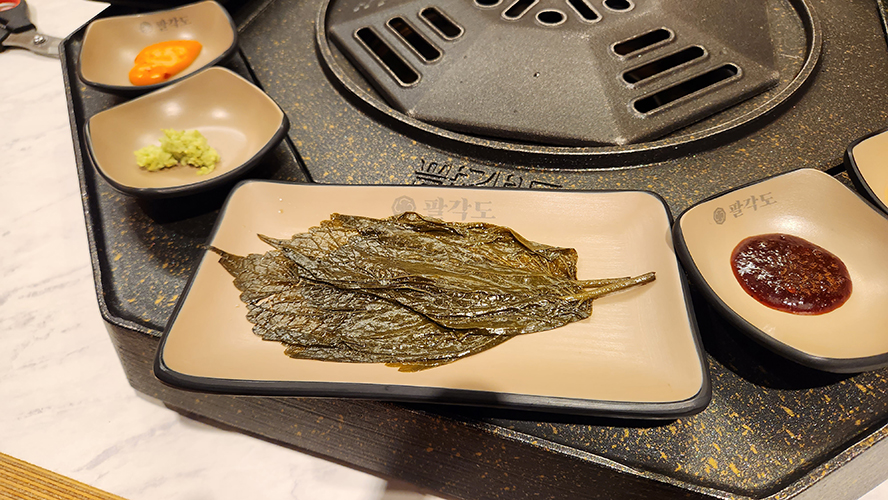기본으로 세팅되어 있는 것들이 김치와 무생채, 깻잎, 백김치, 김등과 마늘, 겨자등의 양념소스가
