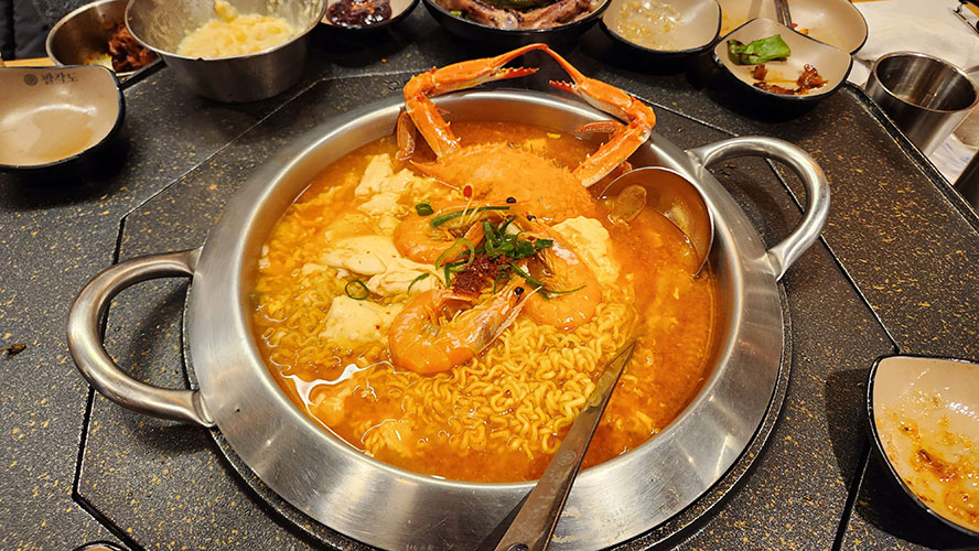 해물라면에 새우, 게, 순두부(?) 등이 들어가 있어 개운하고 시원한 맛입니다