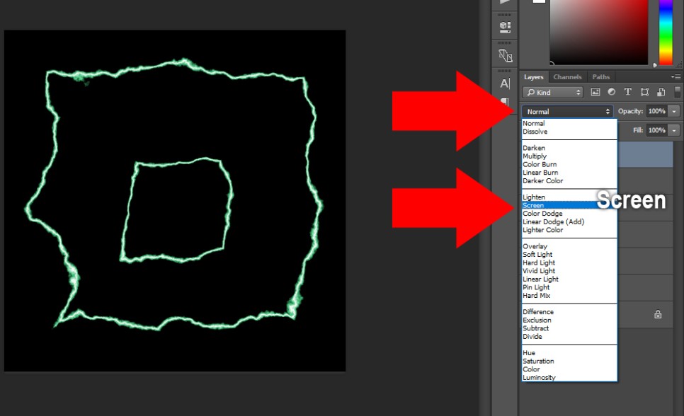 Normal -> Screen 으로 바꿔 주시면 해당 레이어의 어두운 부분은 없어지고