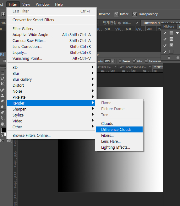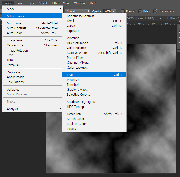 Filter -> Render -> Difference Clouds 적용 후 Image -> Adjustments -> Invert(반전)