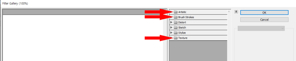 필터는 대부분 Artistic 과 Brush Strokes 그리고 Texture 에서 대부분 나오는데 간혹